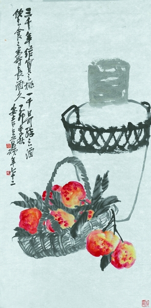 展廳中,《桃宴酒壇圖軸》作為首次與大眾見面的作品,不僅位置醒目,且經(jīng)過了重新裝裱。吳昌碩將桃與酒壇并置一畫,取其“高壽”“長久”之意,題跋中“三千年結(jié)實之桃,一千日可醉之酒,飲之食之壽長久”更是直截了當?shù)乇磉_了祝壽的吉祥含義。復(fù)色的疊加是吳昌碩用色的特點,畫中壽桃運用洋紅、藤黃等色,將桃子成熟時期的飽滿狀態(tài)表現(xiàn)得淋漓盡致,而竹籃、酒壇則充分體現(xiàn)出中國畫“墨分五色”的藝術(shù)精髓,通過濃淡干濕的墨色變化,營造出豐富的畫面層次。