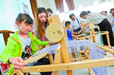 前天在農(nóng)展館1號館內(nèi),一名小朋友在指導(dǎo)老師的點(diǎn)撥下,體驗(yàn)土布紡織技藝。