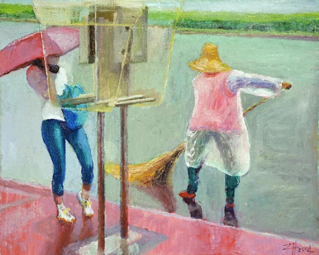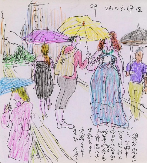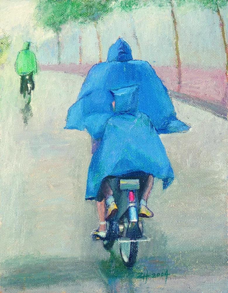 近年每逢夏天,京城的雨多雨大并不亞于南方。我畫了《今夏雨多》系列 ,分別稱作為《大雨》、《中雨》、《小雨》。雨中有共撐一把傘的戀人,有冒雨送孩子上學的母親,還有掃街的環(huán)衛(wèi)女工和電話亭沒完沒了私語的時髦女郎交集在同一雨景中。