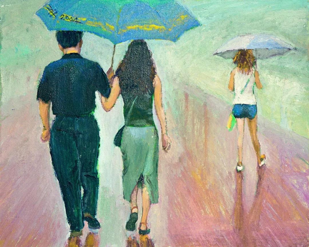在我家的院墻外,有一片多年形成的小樹林,樹種雜而自然。那年秋天正下著雨,一場秋雨一場寒啊,一連幾天我打著傘濕著鞋站在小路邊,出神地觀察打傘的人們打這兒經(jīng)過。近在咫尺,就像是一個舞臺,臺上有男,也有女,有老也有少。他們有的是獨自一人走來,有的是成雙成對的、甚至親密相偎地經(jīng)過;而更多的路人擦肩而過,然后各奔東西。
