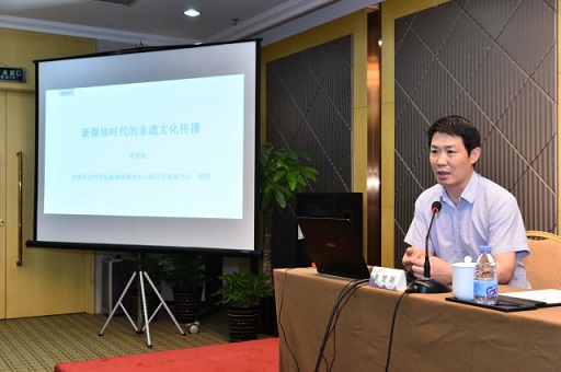 中國(guó)社會(huì)科學(xué)院新媒體研究中心副主任兼秘書長(zhǎng)黃楚新以“新媒體時(shí)代的非遺文化傳播”為題,針對(duì)前新媒體傳播移動(dòng)化、故事化、視頻化的發(fā)展趨勢(shì),分析了新媒體在非遺文化傳播中的優(yōu)勢(shì)作用,以及如何利用新媒體助力非遺文化傳播。