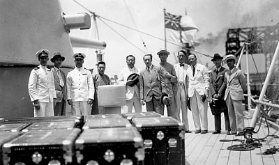 參加中國藝術(shù)英倫國際展覽會的中英工作人員與英國海軍重巡洋艦“薩??恕碧柵為L等合影(左四馬衡,左五為鄭天錫特派員,右二為莊尚嚴(yán),右四為唐惜芬) 資料圖片