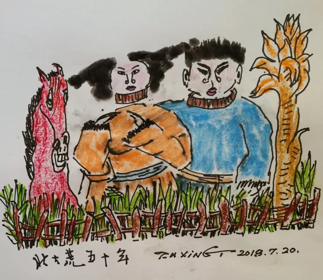 不過,大老張干活不惜力,他長得人高馬大,一膀子力氣,麥收豆收,滿滿一車的麥子和豆子,他都是一個人裝車卸車,不需要幫手。需要幫手的時候,他愛叫上我。因為他愛叫我給他講故事,他最愛聽水滸。我們倆常常為爭誰坐水滸里的第一交椅而掰扯不清,我說是豹子頭林沖,他非要說是阮小二,因為阮小二是打魚的,他家祖上也是打魚的。那都是哪輩子的事了?自從他爺爺闖關東之后,他就會趕馬車。