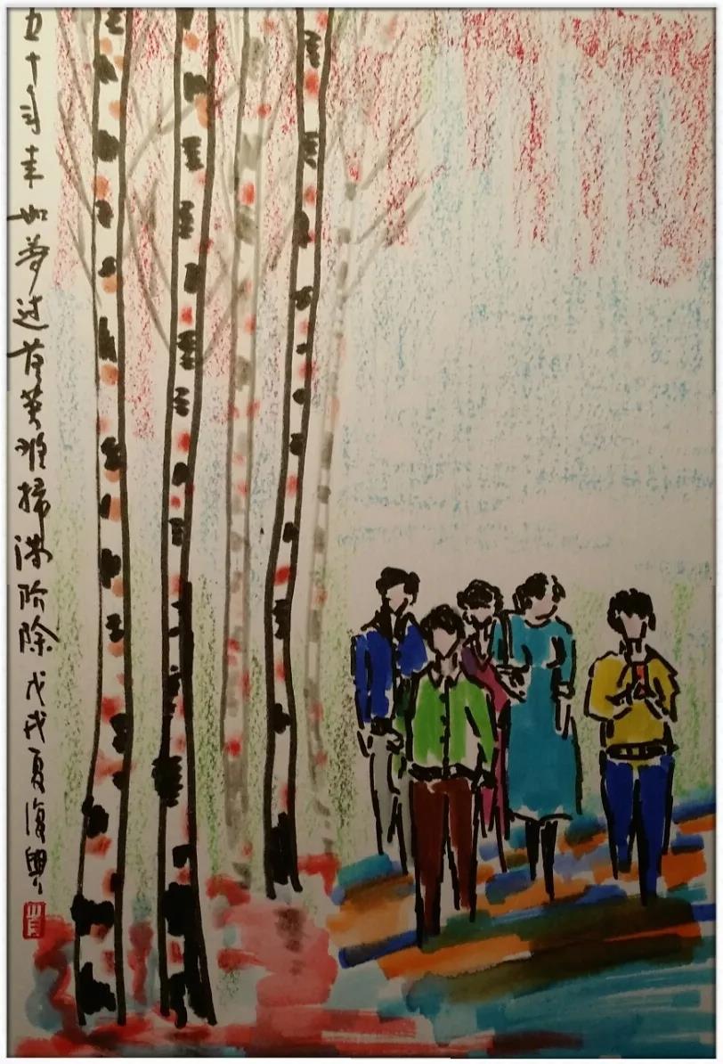 想起李賀年輕的詩句:幾度青春老,千年白日長。不禁感喟。五十年過后的今天,雖然有日子的重合,卻難以有青春的重現,落下的葉子,不會如鳥一樣,重新飛上枝頭。兩鬢蒼蒼的我們,可以在觥籌交錯的聚會中、在發(fā)黃的老照片的展覽中,在花枝招展的歌舞晚會中,無盡懷舊,緬懷青春。青春如花,盡管也曾經開放過,卻是一朵謊花。