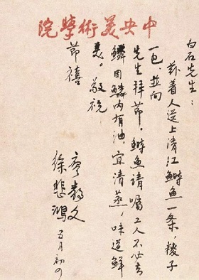 徐悲鴻在端午佳節(jié)將至之際,專門安排人給白石老人送上鰣魚、粽子等節(jié)日禮物,在信中還細(xì)心地囑咐鰣魚的烹飪方法,從中可見徐悲鴻對白石老人真切的無微不至的照料與關(guān)懷。此札書于上世紀(jì)五十年代初 (因所用信箋為 “中央美術(shù)學(xué)院”專用箋,而中央美院定名于1950年4月,悲鴻1953年9月去世,故斷定寫于1950年至1953年間),至今已有六十多年了,讀此札可知鰣魚之貴重,亦可證悲鴻與白石之交誼,真乃藝壇之佳話也。