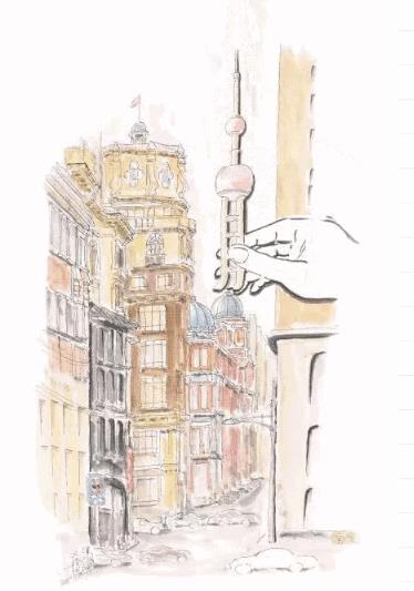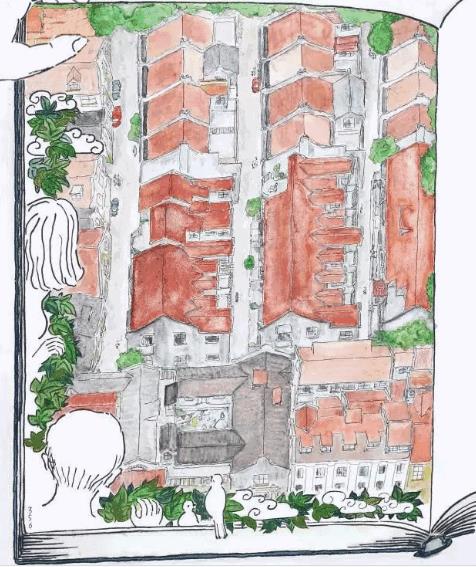 整片城市老街景,被鑲嵌在書中,那些上海的紅色屋頂是童話的顏色。爺叔想表達(dá)什么?左側(cè)翻書的大手和男女后腦勺都沒上色啊,下方小鳥尾巴怎么伸出了畫面,他解釋說,“這是夢中的效果”。