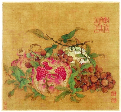 中秋美食豐富多樣,畫家筆下的花果佳肴也姿彩斐然。美國波士頓美術館藏有南宋畫家魯宗貴的《吉祥多子圖》,畫中的橘子、葡萄和石榴采用鮮艷明麗的色彩和密集的構圖,果實在綠葉的穿插映襯下顯得格外突出,黃、紅、綠、白多種顏色絢爛多彩。橘子、葡萄和石榴都是中秋時節(jié)受歡迎的花果,在中國傳統(tǒng)風俗中,這三種水果還具有多子多福的寓意,喜慶吉祥。