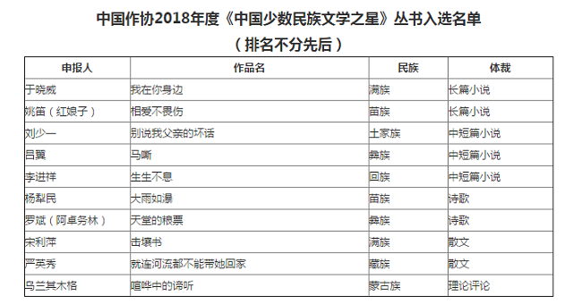 據(jù)悉,《中國(guó)少數(shù)民族文學(xué)之星》叢書(shū),是中國(guó)作家協(xié)會(huì)從2018年起新設(shè)的少數(shù)民族文學(xué)發(fā)展工程出版扶持項(xiàng)目。該項(xiàng)目旨在借助“21世紀(jì)文學(xué)之星”叢書(shū)之光,創(chuàng)立培育少數(shù)民族文學(xué)新生力量和文學(xué)精英的人才工程,培養(yǎng)扶持少數(shù)民族青年作家、推出文學(xué)精品。中國(guó)作家協(xié)會(huì)5月15日正式發(fā)布工作條例和征集通知,截至7月15日,共收到來(lái)自各省市地方作協(xié)等單位推薦的申報(bào)選題77個(gè)。8月29日至31日,2018年度《中國(guó)少數(shù)民族文學(xué)之星》叢書(shū)評(píng)審會(huì)在京舉行,評(píng)委們經(jīng)過(guò)嚴(yán)肅、認(rèn)真的審閱和充分的協(xié)商討論,投票評(píng)選出于曉威、紅娘子、李進(jìn)祥、呂翼、劉少一、楊犁民、阿卓務(wù)林、綠窗、嚴(yán)英秀、烏蘭其木格等10位作家的作品入選本年度叢書(shū)。作者當(dāng)中既有榮獲全國(guó)少數(shù)民族文學(xué)創(chuàng)作“駿馬”獎(jiǎng)的文學(xué)骨干,也有在鄉(xiāng)鎮(zhèn)基層工作的青年詩(shī)人,既有堅(jiān)持文學(xué)創(chuàng)作20多年的守望者,也有近幾年才開(kāi)始創(chuàng)作的文學(xué)新人,還有優(yōu)秀的網(wǎng)絡(luò)文學(xué)作家,體現(xiàn)了當(dāng)前少數(shù)民族青年作家創(chuàng)作的新成就。