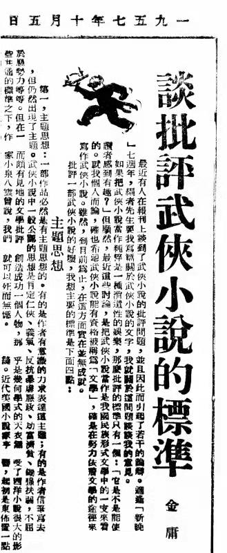 金庸1957年10月5日發(fā)表在香港《新晚報》上的文章《談批評武俠小說的標凖》,內(nèi)中明確談到其自身的創(chuàng)作理念。
