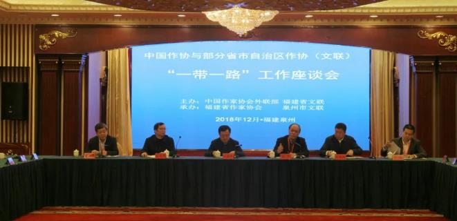 12月18日至21日,由中國作家協(xié)會(huì)外聯(lián)部和福建省文學(xué)藝術(shù)界聯(lián)合會(huì)主辦,福建省作家協(xié)會(huì)和泉州市文學(xué)藝術(shù)界聯(lián)合會(huì)共同承辦的中國作協(xié)與部分省市自治區(qū)作協(xié)(文聯(lián))“一帶一路”工作座談會(huì)在福建泉州召開。會(huì)議旨在深入學(xué)習(xí)領(lǐng)會(huì)習(xí)近平總書記提出的“一帶一路”倡議的重要意義,交流、總結(jié)過去幾年來,中國作協(xié)和有關(guān)地方作協(xié)文聯(lián)組織作家服務(wù)“一帶一路”建設(shè)的經(jīng)驗(yàn)和做法,理清思路,集思廣益,找準(zhǔn)中國作協(xié)組織,服務(wù)“一帶一路”建設(shè)的切入點(diǎn),發(fā)力點(diǎn),采取操作性強(qiáng)的辦法,探索有效的途徑,在推動(dòng)文明互學(xué),促進(jìn)民心相通和構(gòu)建人類命運(yùn)共同體的實(shí)踐中發(fā)揮文學(xué)的獨(dú)特作用。