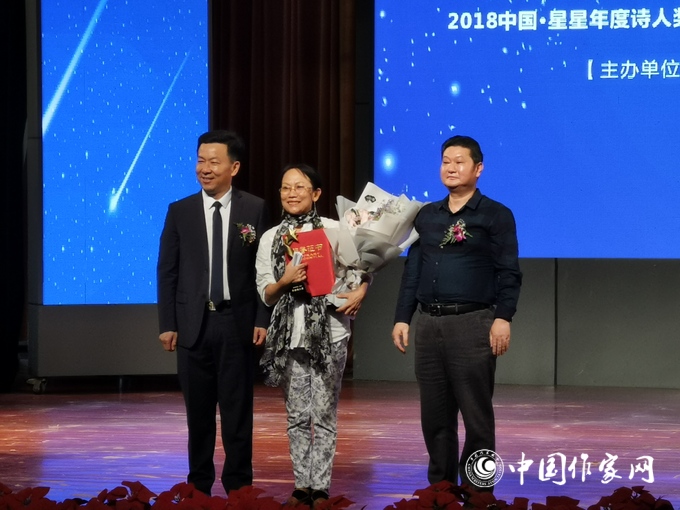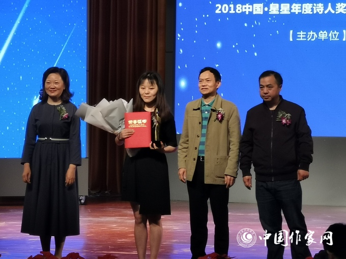 嘉賓為年度詩(shī)人獎(jiǎng)獲得者馬莉頒獎(jiǎng)