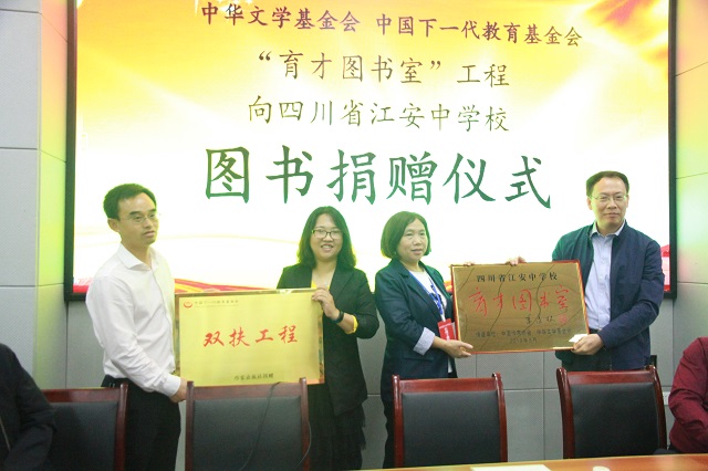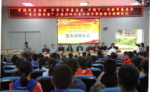 5月28日上午,中國作家協(xié)會、中華文學(xué)基金會、中國下一代教育基金會 “育才圖書室”工程向四川江安中學(xué)校圖書捐贈儀式在江安中學(xué)學(xué)術(shù)廳舉行。中國作家出版集團(tuán)管委會副主任、中華文學(xué)基金會秘書長鮑堅(jiān),中國下一代教育基金會秘書長陳曉紅,中國人民大學(xué)團(tuán)委副書記特木欽,四川省作家協(xié)會副巡視員羅勇,宜賓市作家協(xié)會主席周云和,江安縣人大副主任易奇志,以及江安中學(xué)校長覃寶倫和200余名師生參加了捐贈儀式。