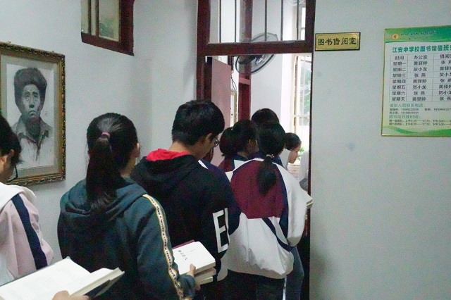 捐贈儀式后,與會嘉賓參觀了江安中學(xué)教學(xué)樓和圖書室。圖書室位于滋蘭樓一層,分閱讀室和借閱室,學(xué)生們從閱讀室選擇圖書,然后到借閱室辦理借閱。覃寶倫表示,將很快對這萬冊圖書進(jìn)行整理、編號,盡快向全校師生開放借閱。