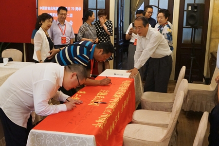作家們?cè)诓稍L團(tuán)旗上簽名留念