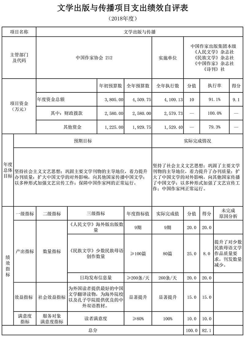 2.“文學(xué)出版與傳播項(xiàng)目”績(jī)效自評(píng)綜述:根據(jù)年初設(shè)定的績(jī)效目標(biāo),項(xiàng)目自評(píng)得分為82.1分。項(xiàng)目全年預(yù)算數(shù)4,509.75萬(wàn)元,執(zhí)行數(shù)為4,109.13萬(wàn)元,完成預(yù)算的91.1%。項(xiàng)目績(jī)效目標(biāo)完成情況:堅(jiān)持了社會(huì)主義文藝思想;鞏固了主要文學(xué)刊物的主導(dǎo)地位,著力提升了辦刊質(zhì)量;擴(kuò)大了中國(guó)文學(xué)的對(duì)外影響,向其他國(guó)家傳播了中國(guó)文學(xué);以多種形式加強(qiáng)了文藝宣傳工作;中國(guó)作家網(wǎng)正常運(yùn)行。發(fā)現(xiàn)的主要問(wèn)題及原因:一是部分績(jī)效指標(biāo)設(shè)置不科學(xué),不利于績(jī)效評(píng)價(jià)和實(shí)際工作的開(kāi)展,執(zhí)行過(guò)程中完成難度較大;二是文學(xué)刊物的發(fā)行需要進(jìn)一步提高。下一步改進(jìn)措施:根據(jù)項(xiàng)目目標(biāo)要求和實(shí)際工作開(kāi)展情況,合理設(shè)置績(jī)效指標(biāo),著力突出文學(xué)刊物的受眾面和影響力。