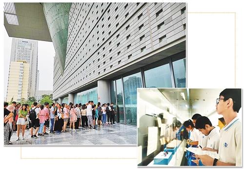 左圖 在首都博物館門(mén)前排隊(duì)等待入館的參觀者。 下圖 帶著博物館任務(wù)單來(lái)參觀的學(xué)生。廉 丹攝