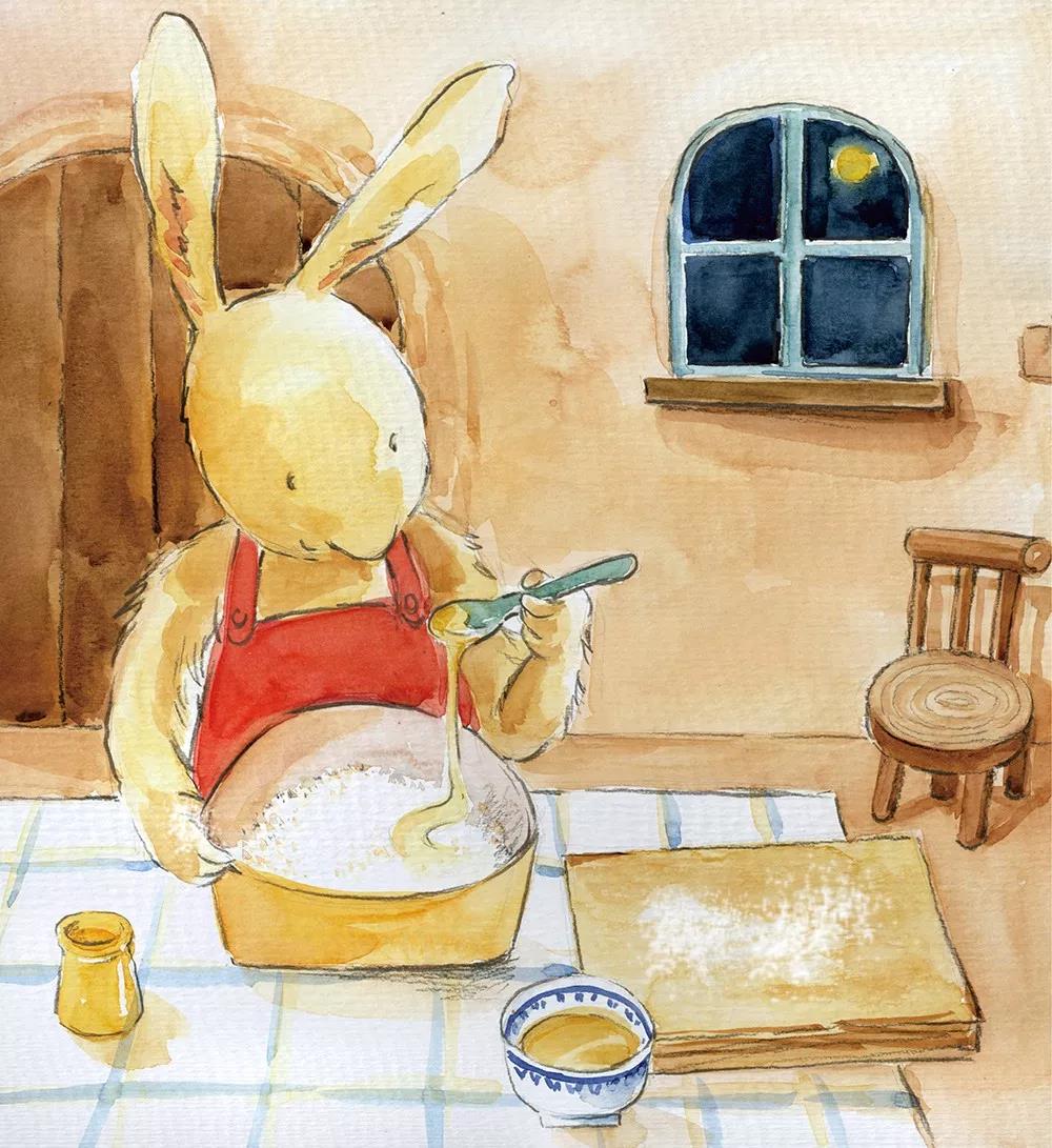 故事情節(jié)輕松活潑、主人公形象軟萌可愛。用文字、畫面雙線的敘事結構,講述了兔媽媽收集材料,為小兔子們制作月餅過中秋,也畫出了大野狼先生盼望過節(jié)的心路歷程。構思巧妙,頗有新意。