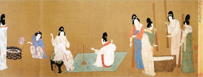 《搗練圖》原來由圓明園收藏,后流失海外,現(xiàn)藏于美國波士頓博物館。它描繪的是貴族婦女搗練縫衣的場景。古代用生絲制衣,但生絲編織起來容易滑脫,所以在織前,先用搗錘把絲織品敲扁,然后還要經(jīng)過脫膠的程序,這樣可以使絲織品表面變得致密。在這幅長卷式的《搗練圖》中,一共畫了12個(gè)人物形象,按勞動(dòng)工序分成搗練、織線、熨燙三個(gè)場面。