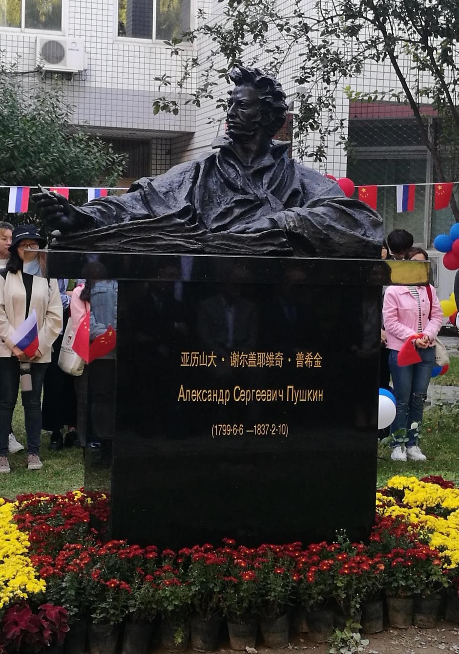 為慶祝中華人民共和國成立70周年、中俄建交70周年、普希金誕辰220周年及首都師范大學(xué)建校65周年,10月8日,首都師范大學(xué)外語學(xué)院、普希金之家北京分部主辦了普希金雕像揭幕儀式,儀式在首都師范大學(xué)外語學(xué)院秋意盎然的花園中舉行。