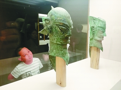 一位小觀眾對(duì)國(guó)家博物館“古蜀華章展”中的青銅頭像產(chǎn)生了興趣。本報(bào)記者李韻攝/光明圖片