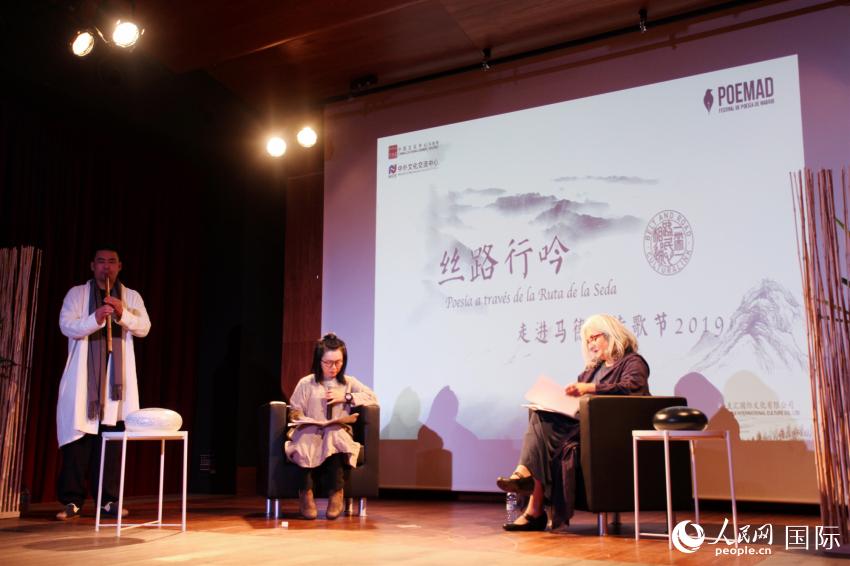 27日,在杜克伯爵文化中心舉辦的“手牽手——中西詩歌對話”活動中,中國詩人周瓚和西班牙詩人安瑪莉亞同臺吟誦各自的詩歌作品,受到現(xiàn)場觀眾的熱烈歡迎。而作為此次詩歌節(jié)的重點活動,28日晚在馬德里中國文化中心舉辦的“絲路行吟——知畫·知音·知境·中國山水詩路”體驗活動上,展出了《富春山居圖》織錦長卷及“中國山水詩路” 數(shù)十幅攝影圖片和精美視頻;中國詩人周瓚根據(jù)同名長詩改編的詩歌劇場作品《隨黃公望游富春山》,剖析中國當代詩歌劇場的藝術實驗與文化實踐,她還與西班牙漢學家宮碧蘭合作,分別用中西文現(xiàn)場朗誦原創(chuàng)詩作;古樂演奏者王光明用中國傳統(tǒng)樂器蕭吹奏古曲《渭城曲》,并朗誦《蘭亭集序》,現(xiàn)場反響熱烈,數(shù)百位西班牙觀眾對中國詩人與藝術工作者的精彩演出報以熱烈的掌聲。
