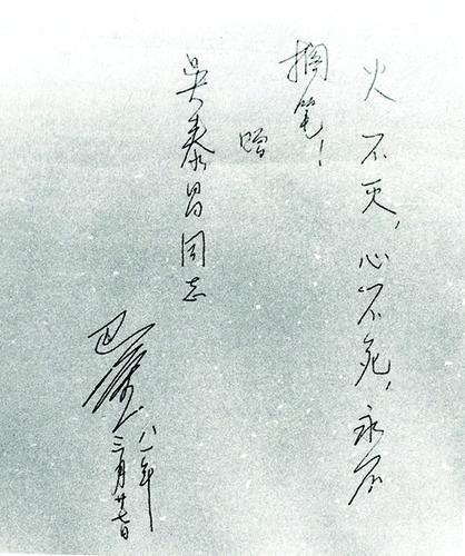 茅盾辭世當(dāng)晚,《文藝報(bào)》急電吳泰昌,讓他即刻請(qǐng)巴金寫紀(jì)念茅盾的文章。吳泰昌向李小林轉(zhuǎn)達(dá)了報(bào)社的請(qǐng)求。小林說,爸爸會(huì)寫的,他現(xiàn)在情緒不好,稍后寫。果然,巴金很快寫成《悼念茅盾同志》,交給了吳泰昌,稿件很快以掛號(hào)航空寄回編輯部。1981年4月22日,《文藝報(bào)》率先刊出此文。月底,吳泰昌去巴金家,向巴老匯報(bào)《文藝報(bào)》刊登悼念茅盾的專版情況。臨別時(shí),巴金把一張?jiān)葏翘┎?qǐng)巴金題字的畫片交給他,上面巴金題寫道:“火不滅,心不死,永不擱筆!巴金八一年三月廿七日?!贝巳掌?,正是巴金獲悉茅盾去世的這天。