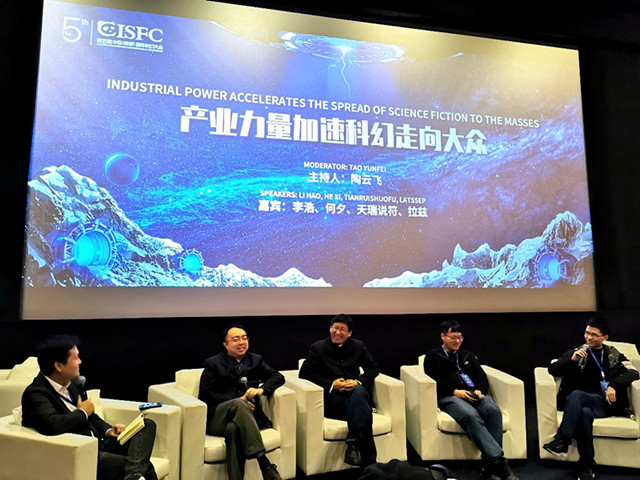 產(chǎn)業(yè)力量推動科幻文學(xué)走向大眾”分論壇現(xiàn)場 (左至右:閱文集團(tuán)出版內(nèi)容部總監(jiān) 陶云飛、知名科幻作家 何夕、科幻世界雜志社副總編輯 拉茲、閱文集團(tuán)科幻頻道資深編輯 李浩、閱文集團(tuán)旗下作家 天瑞說符)