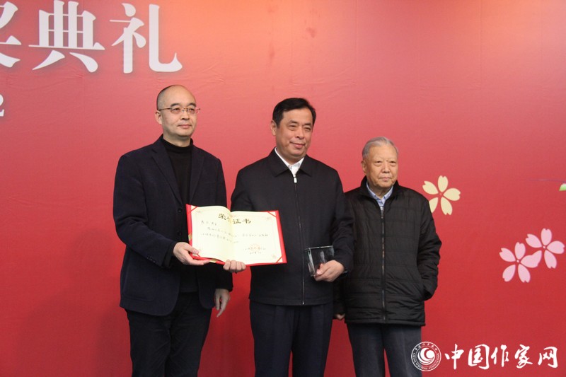 中國(guó)作協(xié)副主席何建明宣讀本屆榮譽(yù)獎(jiǎng)的作家名單