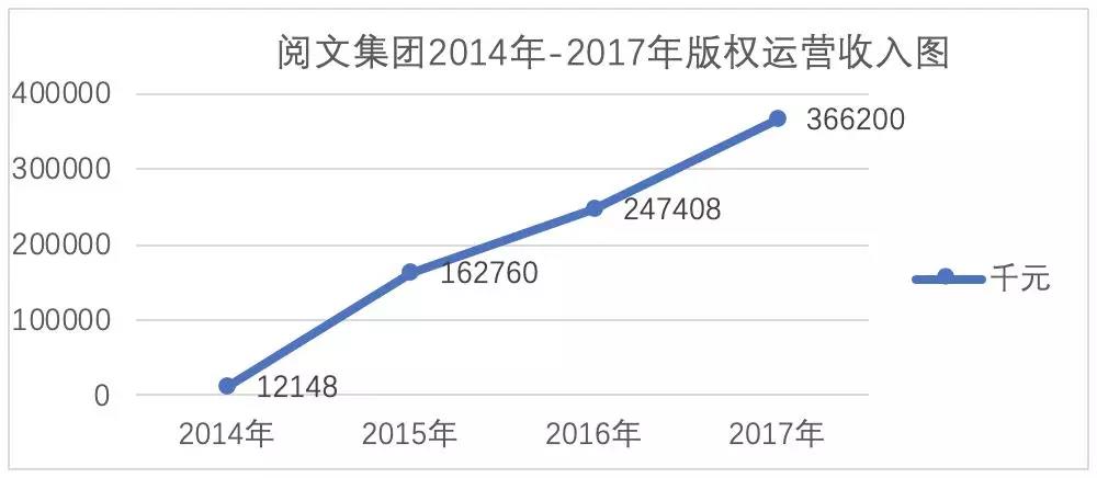 另外以閱文集團(tuán)為例,全版權(quán)運(yùn)營收入目前已經(jīng)成為其第二大收入來源。閱文集團(tuán)2014年到2017年的版權(quán)運(yùn)營收入呈現(xiàn)一個(gè)總體持續(xù)增長的趨勢,在2015年合并盛大文學(xué)之后,版權(quán)運(yùn)營年收入從1214萬元增長到1.63億元,到2017年,達(dá)到3.66億元,出現(xiàn)了飛躍式增長。