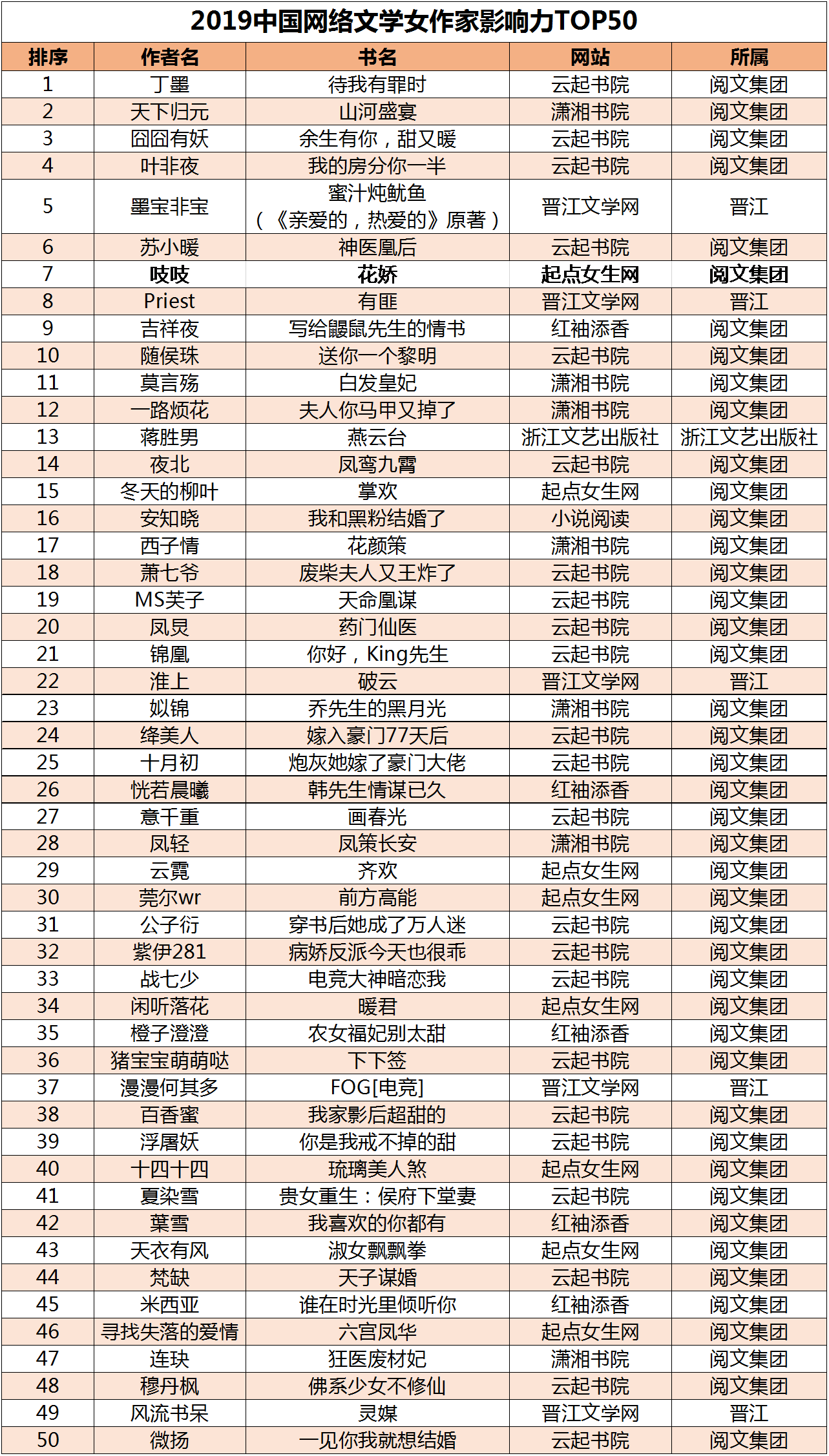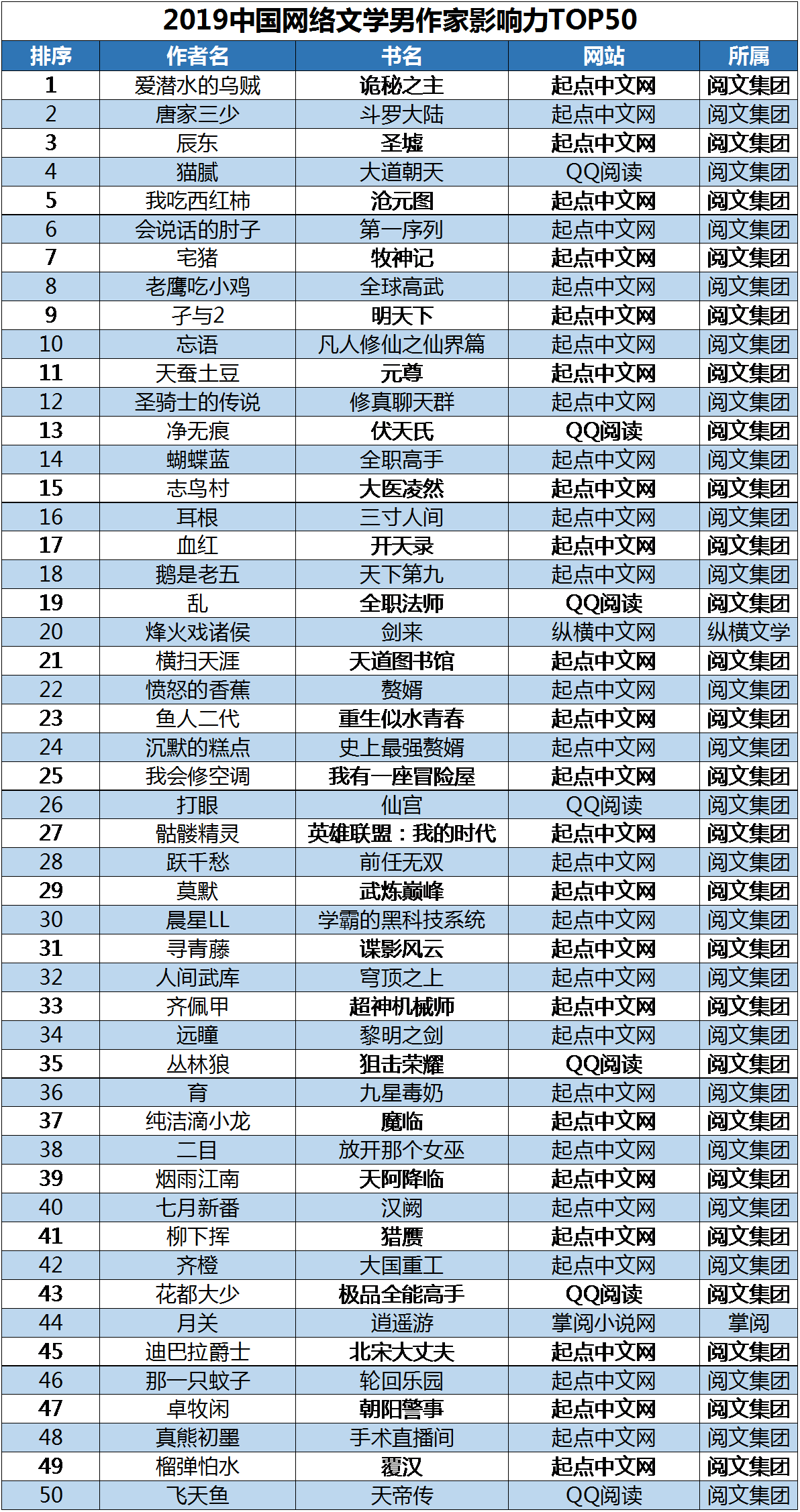 2019年中國網(wǎng)絡(luò)作家影響力榜男作家TOP50及女作家TOP50