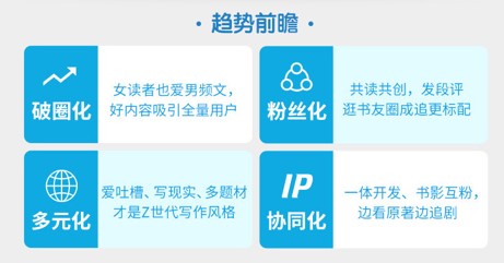 當(dāng)下,網(wǎng)絡(luò)文學(xué)行業(yè)面對(duì)新常態(tài),也產(chǎn)生了新變化:Z世代用戶崛起,他們的表達(dá)欲更強(qiáng),提出個(gè)性化的閱讀需求;中生代作家崛起,成為網(wǎng)絡(luò)文學(xué)行業(yè)的中堅(jiān)力量,年輕作家也帶著新的時(shí)代印記將不同風(fēng)格融入作品中;網(wǎng)文IP由閱讀場(chǎng)景到影漫游場(chǎng)景的延伸,也催生著更多的網(wǎng)絡(luò)文學(xué)表達(dá)形態(tài)。本次報(bào)告指出,新時(shí)代下的“新網(wǎng)文”發(fā)展,呈現(xiàn)出四大“新趨勢(shì)”。