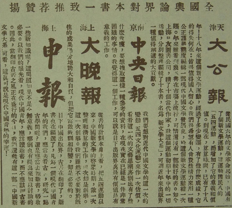 所謂“全國名流學(xué)者對《新文學(xué)大系》之評論摘錄”,總共八則,其中蔡元培、茅盾、郁達夫三則乃下面所刊“總序節(jié)要”或“編選感想”的摘引,剩下的五則是: