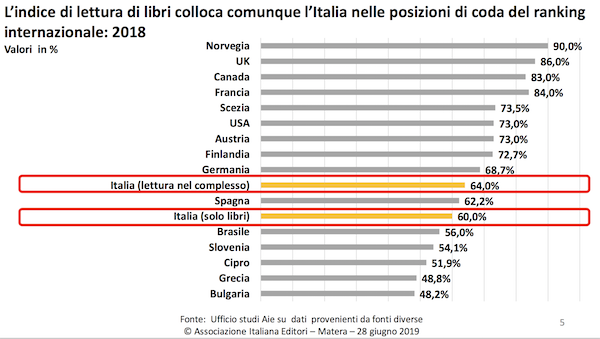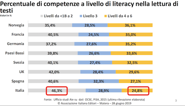 2019年,意大利出版商協(xié)會(huì)成立150周年。7月28日,協(xié)會(huì)主席Ricardo Franco Levi發(fā)表講話,題為“意大利出版社現(xiàn)狀、讀者情況、銷售情況以及新的電子化領(lǐng)域”(若無特別指出,以下數(shù)據(jù)皆來自于該文件)。講話的開頭便援引了經(jīng)濟(jì)合作與開發(fā)組織的2015年P(guān)ISA項(xiàng)目數(shù)據(jù)。