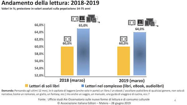意大利的出版商會(huì)出書,也會(huì)賣書,這一點(diǎn)從它們積極參與建設(shè)網(wǎng)上書店便可以看出。同時(shí),它們也重視讀者。意大利出版商協(xié)會(huì)的報(bào)告以PISA項(xiàng)目開篇,來引出他們對(duì)讀者情況的調(diào)查。以下是出版商協(xié)會(huì)給出的2018年與2019年14到75歲意大利人的閱讀情況: