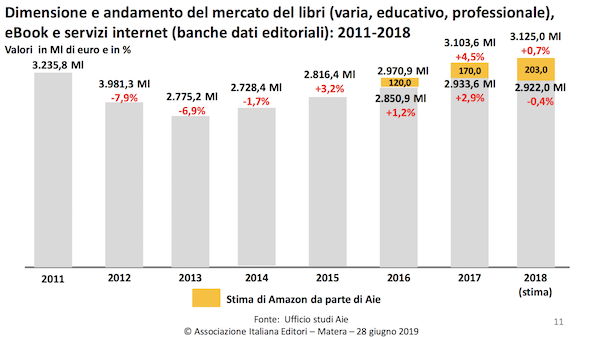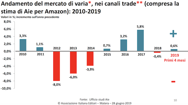 就圖書市場而言,除去教材等專業(yè)型書籍,意大利出版商協(xié)會(huì)給出了2010年至2019年十年間的銷量數(shù)據(jù),同時(shí)算上了估算的亞馬遜數(shù)據(jù):