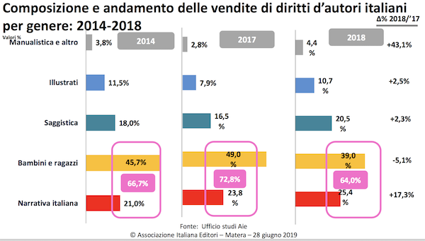而就版權(quán)銷售而言,意大利圖書市場也有增幅,主要是兒童圖書以及敘事文學(xué)類,其在整個(gè)版權(quán)市場中所占比例,在2018年達(dá)到了64%。