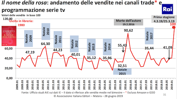 其中淡藍(lán)色方框所標(biāo)注的時(shí)間節(jié)點(diǎn)分別為每年圣誕節(jié)??梢姡フQ節(jié)都會(huì)拉動(dòng)銷量。2016年2月19日作者去世的時(shí)候,銷量達(dá)到了基準(zhǔn)值的90.62%。而2019年3月至4日至25日,最新同名電視劇在意大利電視臺(tái)Rai播出,這再度拉動(dòng)了該書的銷量。人們也自然會(huì)將這部電視劇與1986年法國導(dǎo)演指導(dǎo)、歐洲團(tuán)隊(duì)合作、肖恩·康納利出演的同名電影進(jìn)行比較。隨后不久,知名流媒體Netflix等也上線了該電視劇。