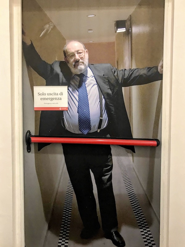 佩魯賈的la Feltrinelli書店中一景:緊急出口上貼著翁貝托·??频木尴瘢懼骸爸挥芯o急情況才能離開”,似乎暗指:若無急事(哪怕疫情來臨?),請(qǐng)勿離開閱讀的世界。? 周之桓
