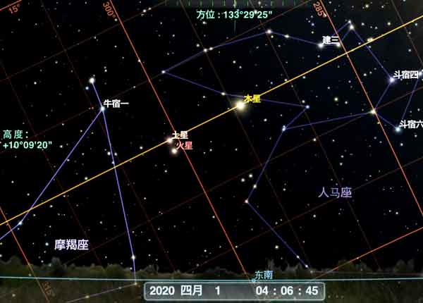 2020年4月1日凌晨4:06北京地區(qū)東南方的星空模擬。圖片來源:Redshift Pro截圖
