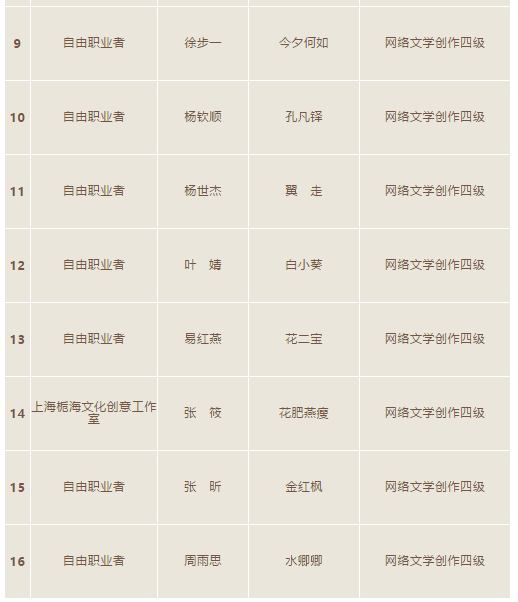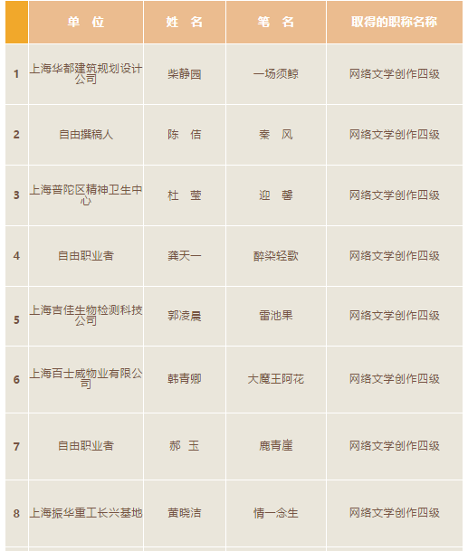 2019年度上海市文學(xué)創(chuàng)作系列網(wǎng)絡(luò)文學(xué)專業(yè)初級技術(shù)職稱認(rèn)定通過人員名單公示