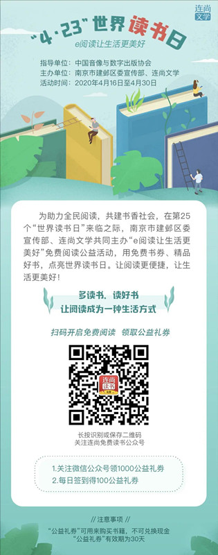 在第25個(gè)“世界讀書(shū)日”即將來(lái)臨之際,由中國(guó)音像與數(shù)字出版協(xié)會(huì)指導(dǎo),江蘇省南京市建鄴區(qū)委宣傳部與連尚文學(xué)共同主辦的“e閱讀讓生活更美好”免費(fèi)閱讀公益活動(dòng)正式啟動(dòng),該活動(dòng)也是“2020年中國(guó)數(shù)字閱讀云上大會(huì)”系列活動(dòng)之一。