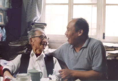 任敏師母1997年底病重臥床,漸至神志不清,先生將臥室隔壁的一間向陽大房間作為師母專用的病房,每天到師母病床前幾次巡視。2002年底任敏師母病逝,我去先生家吊唁。先生身著黑衣,言談平靜,他說,病了五年,任敏走了;生老病死,誰都免不了;我比任敏大三歲,任敏比我先走,如果我比任敏先走,她就是寡婦了;任敏活了八十四歲,也算高壽了。在任敏師母的追悼會(huì)上,先生跪地叩首,高喊師母在天堂等他,說他很快會(huì)去見師母。在我參加過的追悼會(huì)上,沒有見過一次這樣的情景,令我震撼,令我哀傷,也令我肅然起敬。2 008年元月,得知先生再次住院,我和一位同事冒雪到醫(yī)院看望先生。桂芙說,先生這次住院的時(shí)間長,醫(yī)院條件比家里好,準(zhǔn)備在此過春節(jié)。自師母去世后,先生的身體日顯衰弱,精神日顯疲憊。此時(shí)的先生,已不良于行,兩耳聽力也喪失嚴(yán)重,我和先生聊天只好借助筆談,但先生的氣色很好。告辭時(shí)再次與先生合影,沒想到這是我與先生的最后合影。從病房出來,落雪剛剛停止,處處白雪覆蓋,有些地方懸掛的冰凌有一寸多長,寒冷讓路人瑟瑟而行。這是上海少有的一個(gè)嚴(yán)冬。