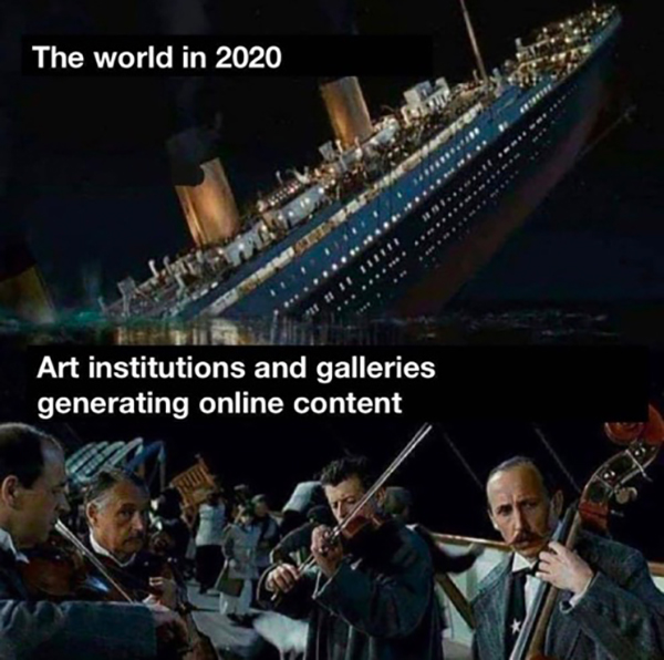 新冠病毒以指數(shù)級(jí)規(guī)模和速度穿越物理邊界的同時(shí),它的次生災(zāi)難也刺激了社會(huì)各界的末日想象。最近在社交媒體上流傳的一個(gè)表情包來(lái)自《泰坦尼克號(hào)》的兩個(gè)場(chǎng)景:下沉中的郵輪象征著“2020年的世界”,甲板上演奏的樂(lè)隊(duì)則代表著“生產(chǎn)線上內(nèi)容的藝術(shù)機(jī)構(gòu)和畫(huà)廊”。這個(gè)表情包給藝術(shù)界敲了一記悶鐘:世界之舟正在沉沒(méi),全球經(jīng)濟(jì)前景岌岌可危,藝術(shù)工作者的安全網(wǎng)和社會(huì)身份難以獨(dú)善其身,難道繼續(xù)生產(chǎn)僅僅是為了維系一種歸屬感?藝術(shù)工作者會(huì)不會(huì)成為這些內(nèi)容的唯一觀眾?