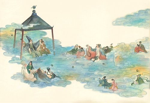 澎湃新聞:如果說(shuō)《洛神賦》的故事性還比較好的話,那《蘭亭序》就需要構(gòu)建一個(gè)能夠同時(shí)推動(dòng)敘事和繪畫(huà)語(yǔ)言的新故事結(jié)構(gòu)去表現(xiàn)了,這個(gè)將水人物化的想法是您還是文字作者的創(chuàng)意?怎么想到要用這樣的方式來(lái)講述這個(gè)故事的?