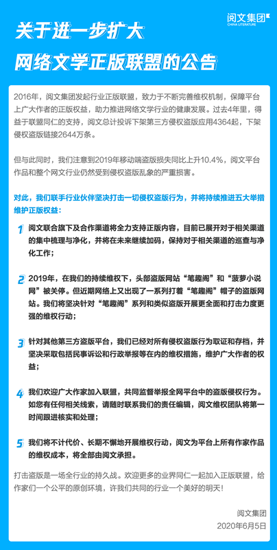 6月5日,閱文集團(tuán)發(fā)布關(guān)于進(jìn)一步擴(kuò)大網(wǎng)絡(luò)文學(xué)整版聯(lián)盟的公告,展現(xiàn)一系列打擊盜版成果,并推五大實(shí)質(zhì)舉措打擊盜版。