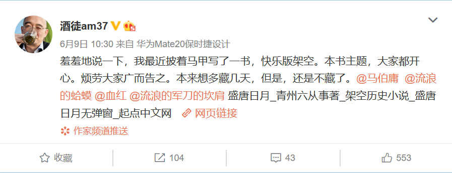 “羞羞地說一下,我最近披著馬甲寫了一書,快樂版架空。本書主題,大家都開心。煩勞大家廣而告之。本來想多藏幾天,但是,還是不藏了?!?月9日,網(wǎng)絡(luò)文學(xué)作家酒徒發(fā)布微博,稱自己正以新筆名“青州六從事”在起點(diǎn)中文網(wǎng)發(fā)布作品《盛唐日月》。眾多作家、讀者轉(zhuǎn)發(fā)評(píng)論, “暗搓搓的小心機(jī)”,“歡迎回歸”。