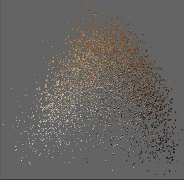 馬諾維奇教授將6000余幅印象派作品進(jìn)行陳列。其中,相似度更高的作品更為靠近。圖中左下角的作品代表人們所熟知的印象派名作。我們可以看到,印象派中其實(shí)包含大量與這些名作風(fēng)格迥異的作品。來源:《數(shù)據(jù)科學(xué)和數(shù)字藝術(shù)史》報(bào)告