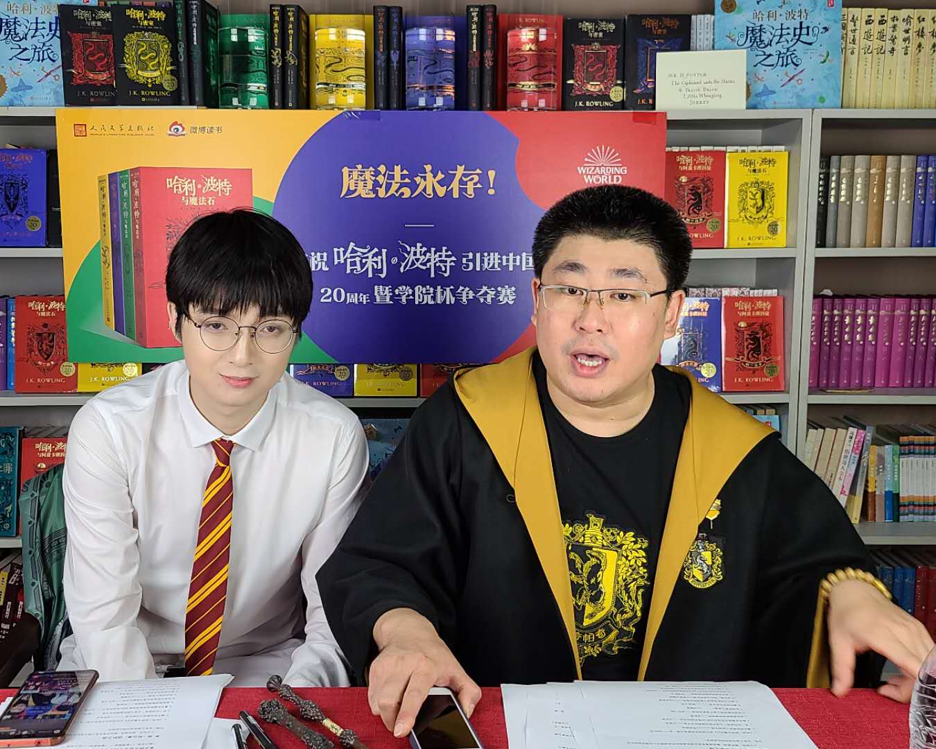7月31日,即哈利?波特與該系列小說作者J.K.羅琳生日當天,由人民文學出版社聯(lián)合網(wǎng)易舉辦的“魔法永存——慶?!?波特’引進中國20周年暨學院杯爭奪賽”活動通過微博平臺舉行,在線觀看“哈迷”超過90萬。中國出版?zhèn)髅焦煞萦邢薰径?、總?jīng)理李巖和人民文學出版社社長臧永清分別致辭,“哈利?波特”系列圖書的責任編輯王瑞琴、馬博和譯者馬愛農(nóng)與數(shù)十萬“哈迷”親密互動,分享20年間讀書感悟?;顒佑汕嗄暝u書演員郭鶴鳴主持。