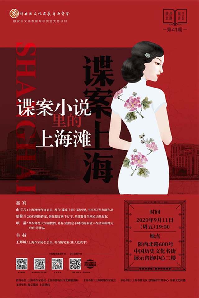第41期陜西北路網(wǎng)文講壇定檔9月11日(周五),本期邀請網(wǎng)絡作家由寶兒、暗修蘭、華東師范大學副教授項靜、青年評論家王輝城一起聊聊諜案類型的網(wǎng)絡小說,以及青年一代網(wǎng)絡作家小說里描寫的上海往事、舊日城市。