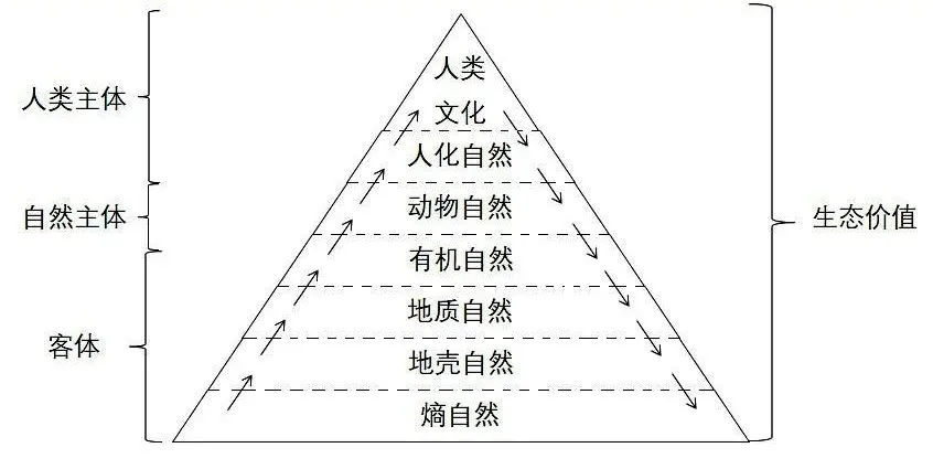 從進(jìn)化論的角度來(lái)看,所有價(jià)值都源于創(chuàng)生的自然:“大自然是生命的源泉,這整個(gè)源泉,而不僅僅是誕生于其中的生命,都是有價(jià)值的,大自然是一切的起源。”人類文化是由具有主體意識(shí)的人類創(chuàng)造出來(lái)的,它是大自然進(jìn)化到高級(jí)階段的產(chǎn)物,因此在這一模型里,客體的自然價(jià)值處于最底層,人類文化創(chuàng)造的價(jià)值處于最頂層。自然進(jìn)化過(guò)程中產(chǎn)生的價(jià)值之間是相互聯(lián)系的,有些價(jià)值完全屬于客體,有些則部分依賴于主體,而后者深深植根于前者之中,需要前者的支撐與維護(hù)。所以這個(gè)金字塔從下到上,價(jià)值的主體性增強(qiáng),客體性減弱,且價(jià)值呈扇形逐步縮小。
